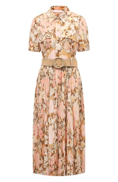 Платье-рубашку с плиссированным подолом из коллекции Summer Swim дополнили нагрудными карманами с клапанами и отворотами на коротких рукавах. Модель с пуговицами на лифе и потайной молнией сбоку сшили из полиэстера. Плетеный ремень из рафии подчеркивает талию.