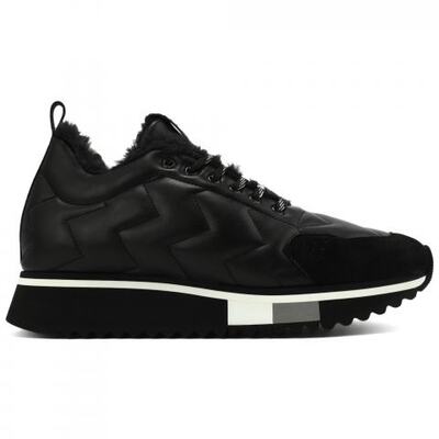 Чёрные кроссовки из искусственной кожи от Fabi. Пара из осенней коллекции бренда подойдёт к повседневным образам в городском стиле. Верх из искусственной чёрной кожи дополнен зигзагообразной строчкой и текстильной шнуровкой. Резиновая подошва с изящными деталями обеспечивает исключительный комфорт. Подкладка выполнена из искусственного меха, а стелька - из текстильной ткани.