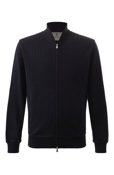 Толстовку из линии Travelwear выполнили из двойного футера в меловую полоску. Трикотаж связали из хлопка, смешанного с кашемиром и шелком, а для манжет, пояса и воротника использовали эластичный трикотаж. Модель с двумя прорезными боковыми карманами застегивается встречной молнией.