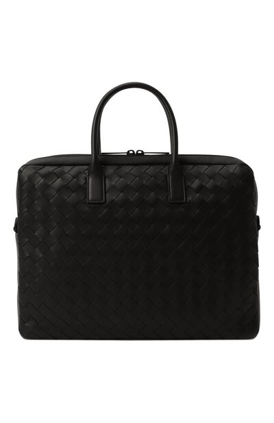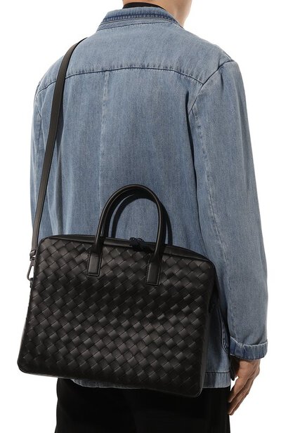 Для создания сумки для ноутбука, застегивающейся встречной молнией, использовали узкие кожаные ленты, которые переплели вручную в фирменной технике intrecciato. Аксессуар с двумя ручками и съемным плечевым ремнем дополнен внешним и тремя внутренними карманами.