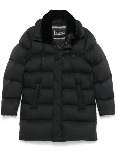 black down-feather filling shell padded design quilted water-repellent insulated design front press-stud and zip fastening detachable faux-fur trim at the hood drawstring hood long sleeves two side welt pockets internal zip-fastening pocket full lining straight hem thigh-length