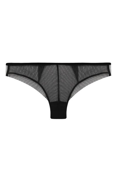 Черные полупрозрачные слипы выполнили из тонкого, почти невесомого материала. Трусы украсили двумя более плотными вставками в виде треугольника. Швы спереди обработали узким кантом, который перекликается с поясом.