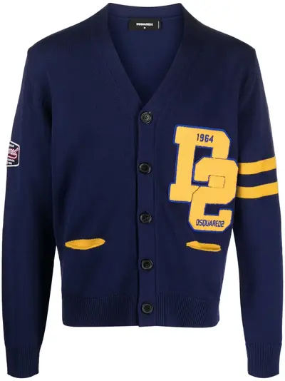 navy blue wool logo patches to the front logo patch at the sleeve V-neck stripe detailing front button fastening drop shoulder long sleeves two side welt pockets ribbed cuffs and hem