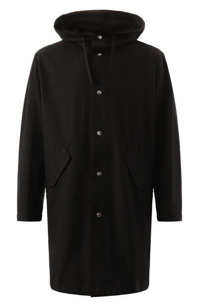 Свободный плащ из хлопкового поплина дополнили двумя прорезными карманами с клапанами и регулируемыми кулисками на капюшоне, поясе и по низу. Парка с контрастным логотипом сзади застегивается кнопками.