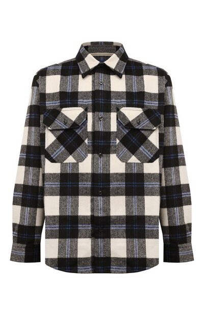 Свободную рубашку в клетку «гленчек» сшили из ткани с добавлением шерсти, начесанной щетками для особенной мягкости. Модель с фигурным низом дополнили накладными нагрудными карманами с клапанами на пуговицах.