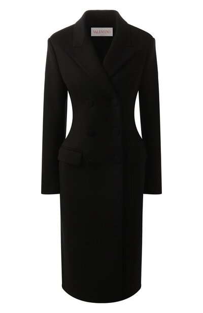 Двубортное пальто с заостренными лацканами и высокой шлицей сзади выполнили из шерсти и кашемира. Модель дополнили спереди тремя карманами, как у классического жакета, и еще парой в боковых швах.