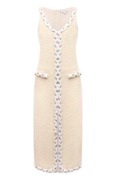 Миди-платье с высоким разрезом и декоративными карманами сшито из твида с хлопком и шерстью. Приталенная модель, застегивающаяся сзади потайной молнией, отделана объемным кантом-косой с цепочкой из кристаллов.