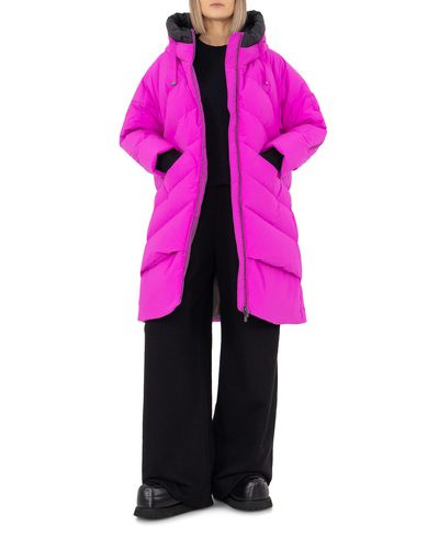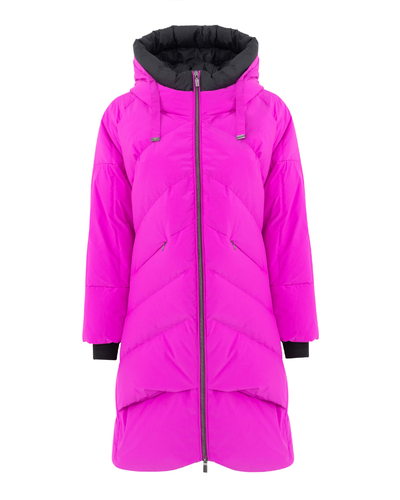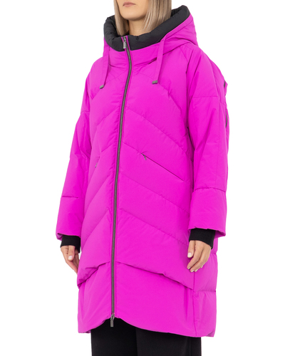 Длинный стеганный пуховик оверсайз цвета фукси. Застежка молния, высокий воротник и капюшон с кулиской защитит от морозов и ветра. Два врезных кармана по бокам застегиваются на скрытую молнию. Модель сшили из матового полиэстера и утеплили легким пуховым наполнителем. Высокие трикотажные манжеты не дадут проникнуть морозам внутрь