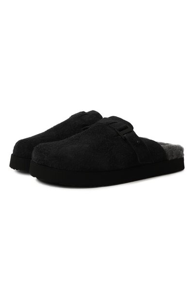 Эти сабо с ремешком на союзке адаптировали для прохладной погоды с помощью мутонового подклада. Замшевую модель установили на широкую резиновую подошву с протектором.
