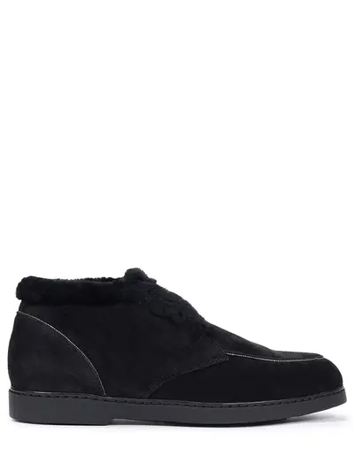-Черные ботинки из бархатистой замши от DOUCAL'S. -Модель с округлым мысом, форму которого подчеркивает декоративный шов с цепочкой Мониль, толстой резиновой подошвой и низким каблуком, опушкой и внутренней отделкой из натуральной овчины.