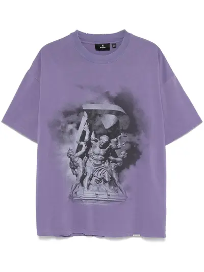 purple cotton jersey texture crew neck graphic print to the front drop shoulder short sleeves graphic print to the rear straight hem