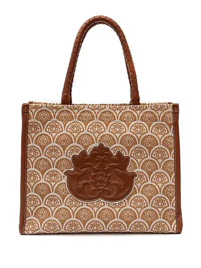 beige leather trim patterned jacquard logo patch to the front two rolled top handles top zip fastening main compartment internal zip-fastening pocket internal logo patch