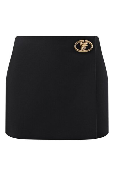 Юбку-шорты с запахом, врезными карманами по бокам и латунной эмблемой VLogo спереди выполнили из креп-кутюра. Модель с подкладом из шелка хаботай застегивается потайной молнией сбоку.
