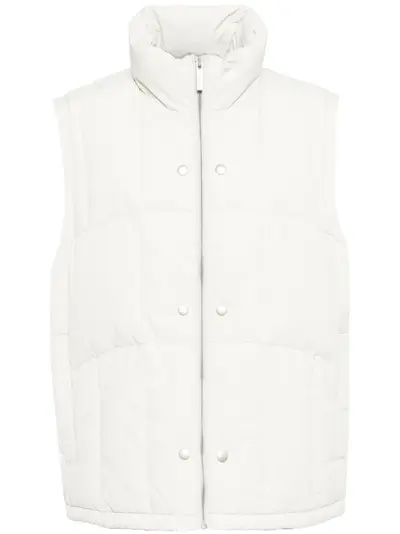 light grey front zip fastening stand-up collar padded design decorative snap button detailing two side inset pockets logo patch to the rear sleeveless drawstring hem