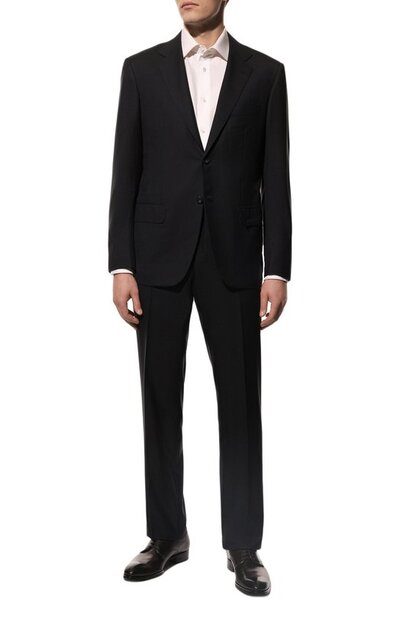 Темно-синий костюм мастера марки сшили исключительно вручную, затратив на производство около 25 часов. Детали, вырезанные из мягкой тонкой шерстяной ткани, кропотливо обработали, точно подогнали друг к другу и многократно отпарили, чтобы комплект не дал усадку. Пиджак с широкими лацканами и прямые брюки со стрелками идеально садятся по фигуре и не сковывают движения.