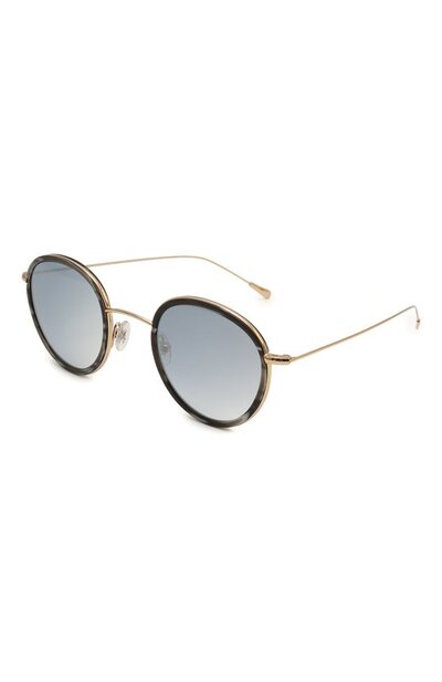 Узкие тонкие дужки у этих солнцезащитных очков контрастируют с более широкой круглой рамкой, подчеркнутой вставкой из ацетата. Для изготовления основы оправы использовали легкий металл, который отполировали до глянцевого блеска. Аксессуар дополнили голубыми зеркальными линзами.