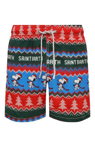 Плавки-шорты с эластичным поясом-кулиской сшили из полиэстера с красочным рождественским принтом с псом Снупи в главной роли. Модель с накладным и двумя врезными карманами дополнена сзади люверсами, не дающими ей вздуваться при погружении в воду.