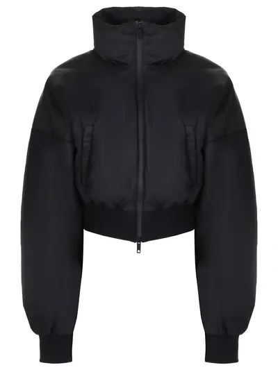 -Черный короткий пуховик от GOOROO. -Модель свободного кроя со спущенной линией плеча, длинными рукавами, трикотажными рельефными манжетами и поясом, воротником-стойкой, прорезными карманами, застежкой на молнию с двумя пуллерами.