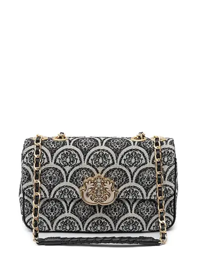 black patterned jacquard gold-tone logo plaque foldover top clasp fastening leather and chain-link shoulder strap main compartment internal zip-fastening pocket