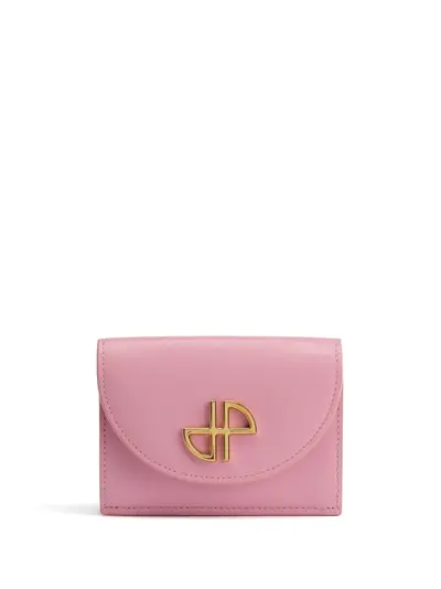 pink calf leather gold-tone logo plaque tri-fold design snap-fit fastening front flap pocket internal logo stamp internal card slots internal note compartments