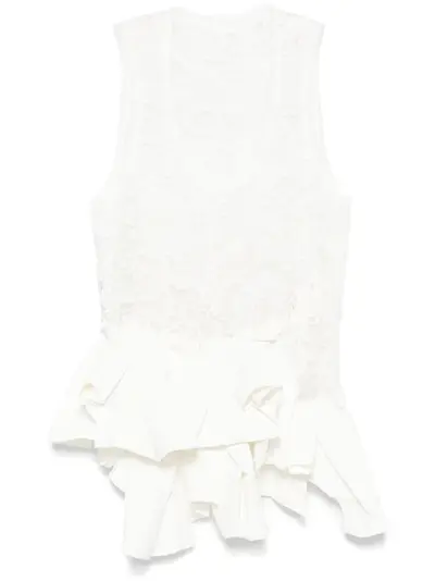 white cotton/faux leather semi-sheer construction mesh panelling floral-lace detailing scoop neck sleeveless pleat detailing asymmetric hem