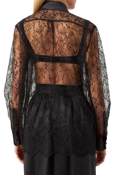 Для изготовления блузы с цветочным узором использовали смесовое кружево на основе вискозы. Отложной воротник, пуговичную планку и манжеты выполнили из гладкого атласа.