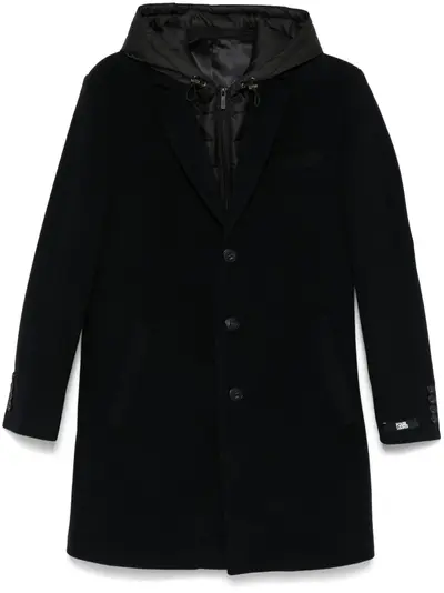 midnight blue wool-cashmere blend brushed effect layered design front button fastening notched lapels detachable quilted panels drawstring hood shoulder pads long sleeves logo patch at the sleeve buttoned cuffs chest welt pocket two side welt pockets central rear vent logo-jacquard lining straight hem thigh-length