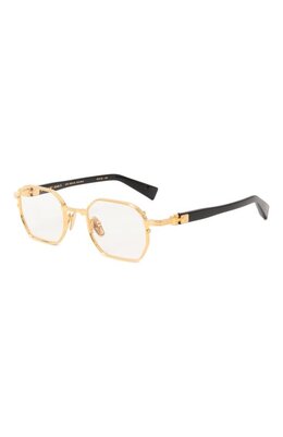 Черную матовую оправу выполнили из прочного ацетата, который не боится царапин и надолго сохраняет первоначальный внешний вид. Чтобы лаконичная модель не выглядела просто, ее дополнили деталями из золотистого титана: нарочито удлиненными креплениями и пластинами с литерой B.