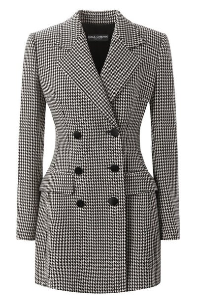 Двубортный жакет в клетку «пье-де-пуль» сшили из ткани на основе шерсти первого пострига с добавлением вискозы. Модель силуэта «песочные часы», дополненную боковыми карманами с клапанами и шелковым подкладом, комфортно носить и на голое тело, и поверх топа.