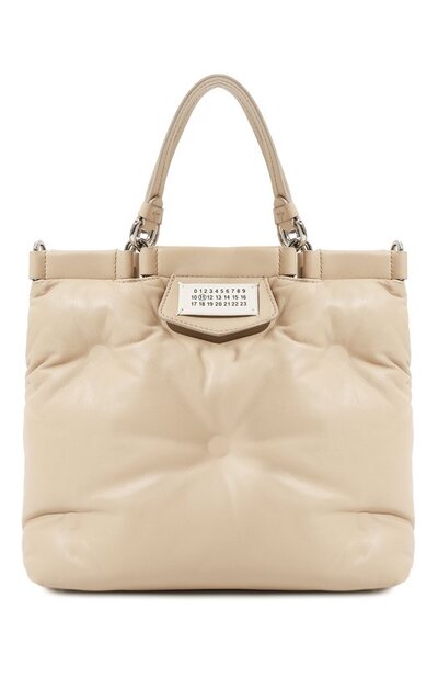 На сумке Glam Slam из наппы с наполнителем сформировали характерную для этой линии термосваренную каретную стяжку. Переднюю панель украсили накладкой с фирменным числовым кодом, а внутренний карман на молнии – брендированным ярлыком. Модель с пуклями и съемным регулируемым плечевым ремнем застегивается потайным магнитом.