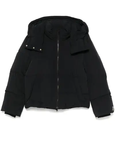 black duck down padded design quilted front two-way zip fastening funnel neck detachable hood long sleeves rubberised logo detail ribbed cuffs full lining internal zip-fastening pocket internal elasticated toggle detailing straight hem