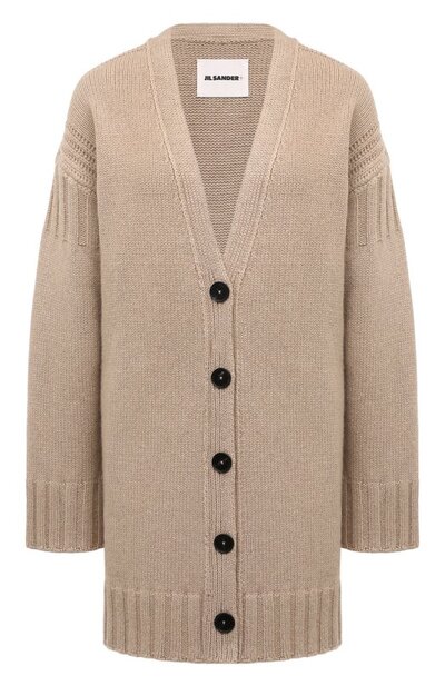 Свободный кардиган с рифлеными манжетами, низом и кантом на плечевом окате связали из кашемировой пряжи. Удлиненная модель с глубоким V-образным вырезом застегивается крупными пуговицами.