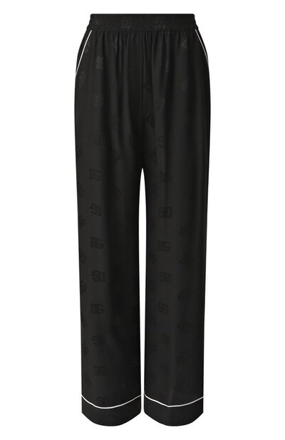 Свободные брюки сшили из шелкового жаккарда с паттерном DG. Модель с эластичным поясом дополнили узким контрастным кантом, подчеркивающим боковые карманы, манжеты и лампасы.
