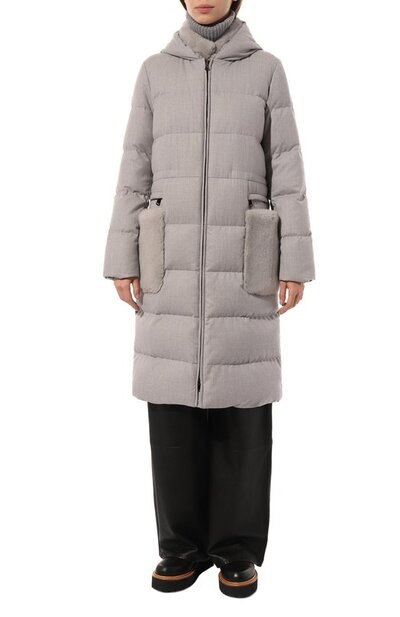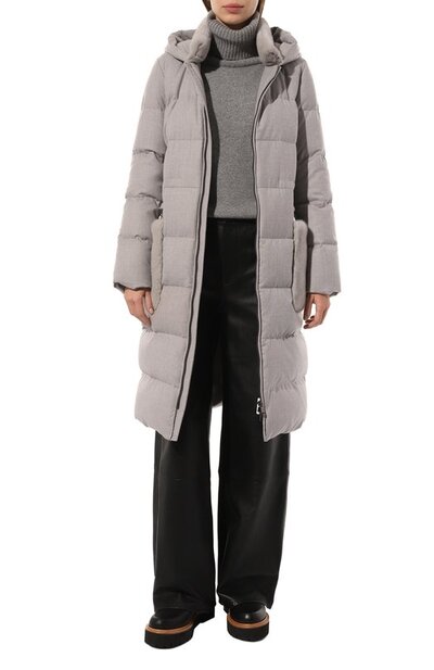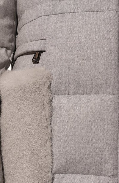 Стеганое пальто из шерстяной фланели дополнили воротником-стойкой из американской норки. Из такого же меха изготовили накладные боковые карманы, над которыми расположили врезные. Модель с потайной кулиской на поясе и подкладом из полиэстера застегивается встречной молнией с внутренней штормовой планкой.