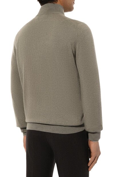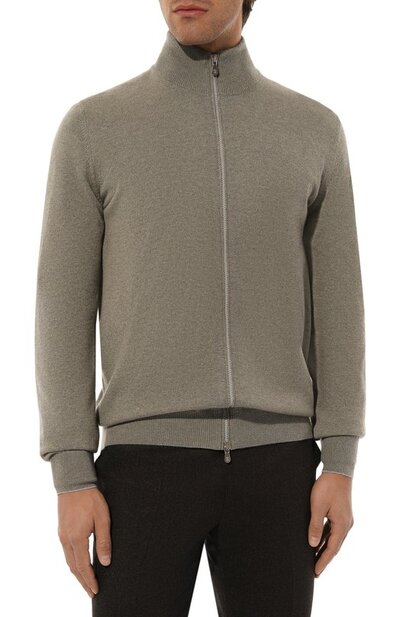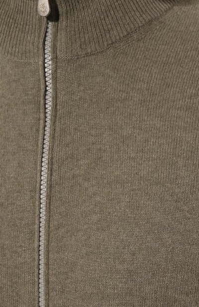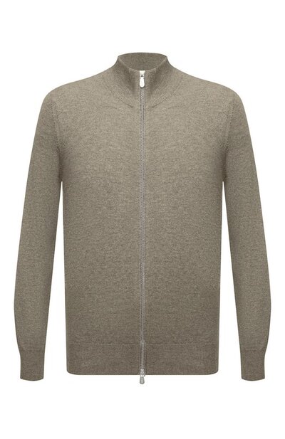 Кардиган из чистого кашемира связали гладью, а широкий пояс, манжеты с узким кантом и высокий ворот выполнили резинкой. Прямая модель застегивается встречной молнией с брендированными пуллерами.