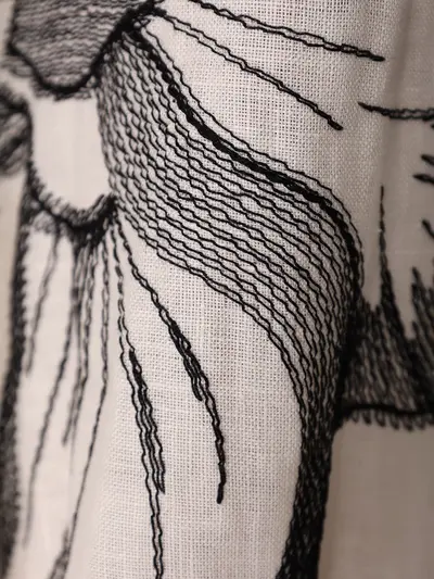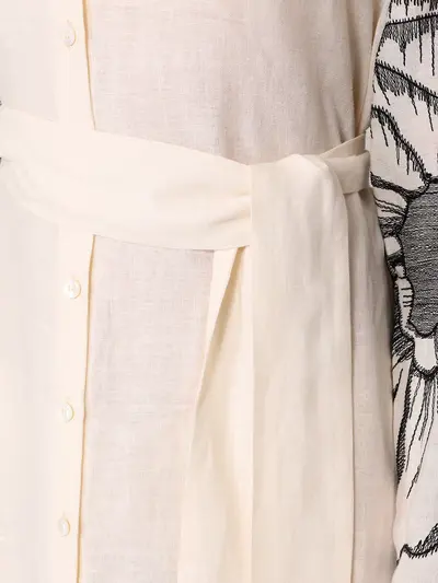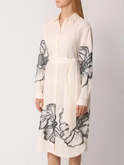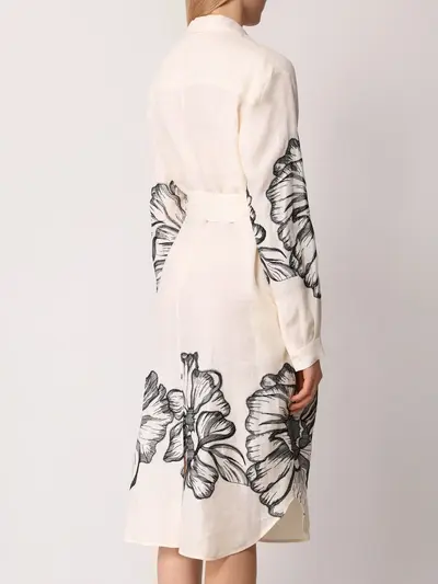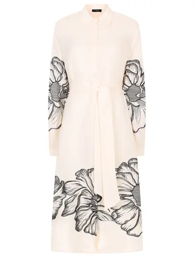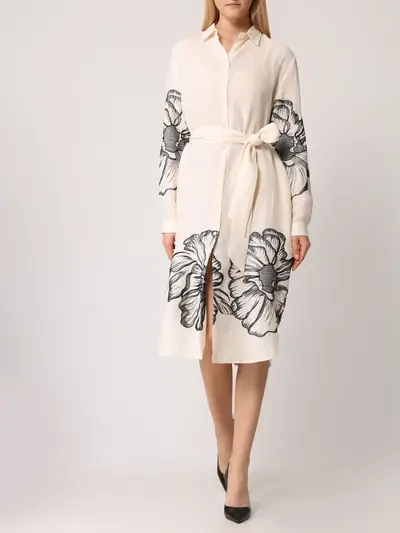 -Кремовое платье-миди из легкого дышащего льна с вышитым цветочным принтом от KITON.