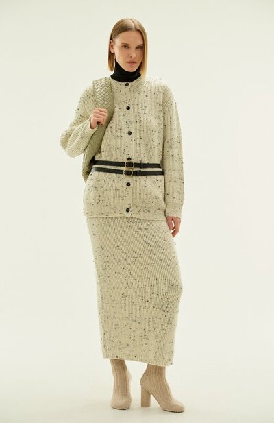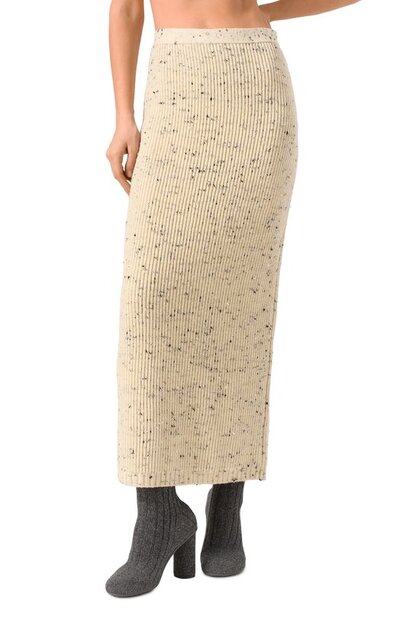 Облегающая меланжевая юбка сшита из шерстяного ребристого трикотажа с небольшим добавлением вискозы. Наши стилисты предлагают носить изделие с парным кардиганом и контрастными ботильонами.