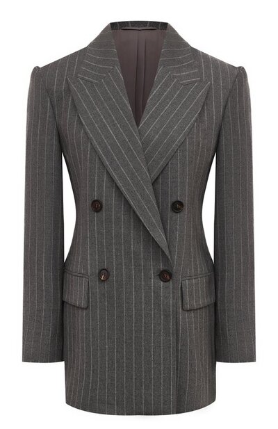 Двубортный жакет в меловую полоску выполнили из муслина, сотканного из шерсти мериноса. Приталенную модель с четкой линией плеч, широким лацканами и тремя прорезными карманами традиционно украсили цепочкой мониль вдоль горловины сзади.
