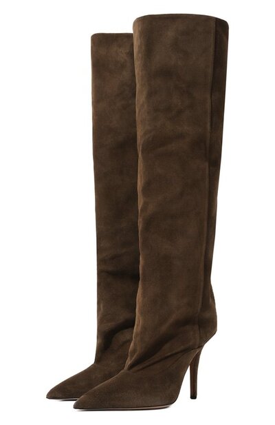 Сапоги Ines с острым носком и широким голенищем выполнили из мягкой замши. Модель без застежки установили на кожаную подошву с высокой шпилькой.