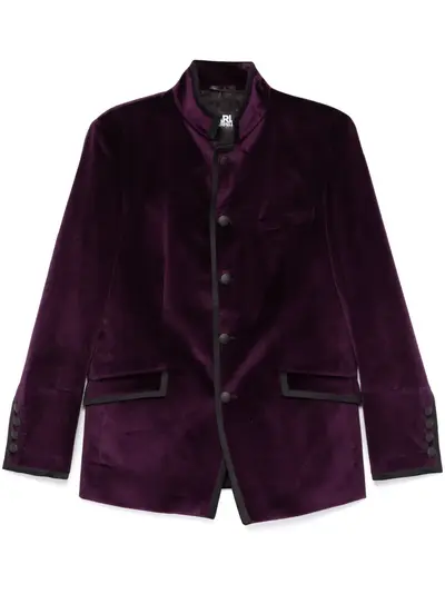 plum purple cotton velvet front button fastening stand-up collar long sleeves buttoned cuffs chest welt pocket dart detailing two front flap pockets central rear vent logo-print lining straight hem