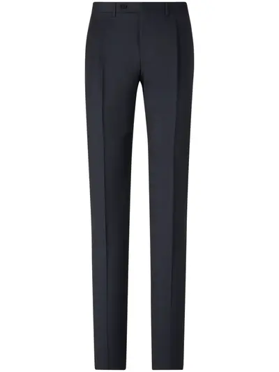 midnight blue wool blend stretch-design twill weave concealed fly and button fastening mid-rise pleat detailing two side slit pockets two rear button-fastening jetted pockets tailored cut