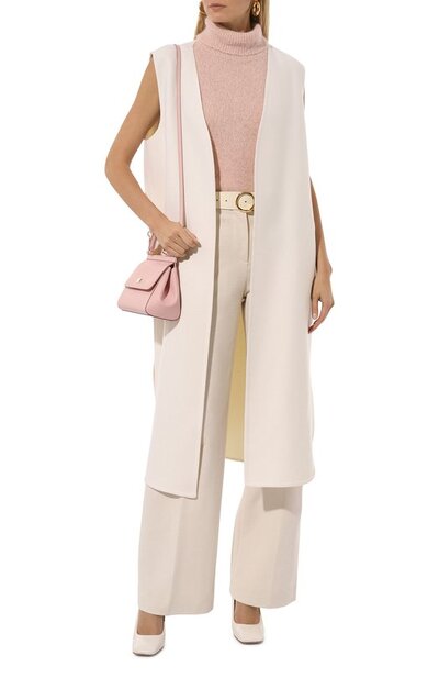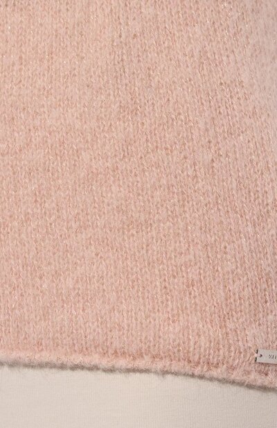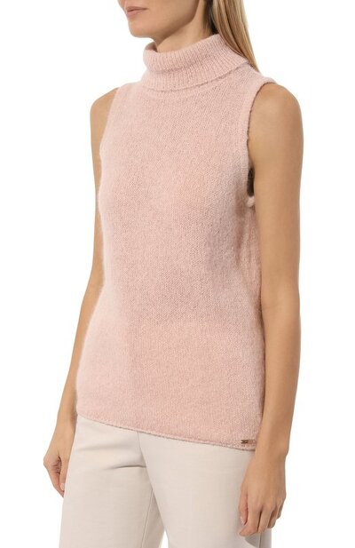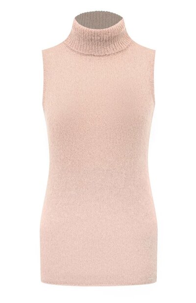 Топ с высокой эластичной горловиной с отворотом органично впишется в образы для прохладной погоды. Модель связали из пряжи на основе шерсти альпака, усиленной полиэстером и полиамидом. Изделие украсили внизу брендированной пластиной.