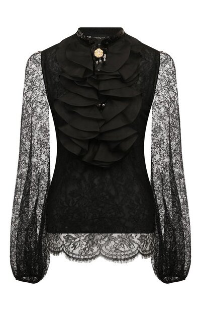 Блузка с объемными рукавами сшита из комбинации шелка и полупрозрачного кружева. Узкий воротник-стойка и пуговичная планка отделаны пайетками. Модель дополнена атласным жабо и брошью-цветком с кристаллами.