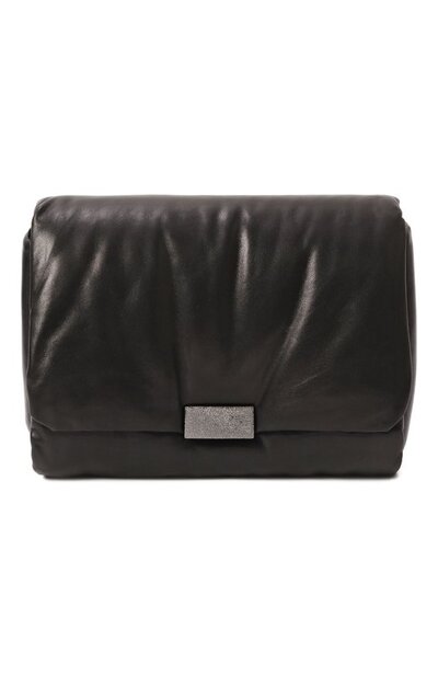 Небольшую объемную сумку с регулируемым плечевым ремнем выполнили из мелкозернистой наппы. Аксессуар с внутренним карманом на молнии закрывается откидным клапаном с магнитной застежкой, обработанной по технологии зеркальной полировки.