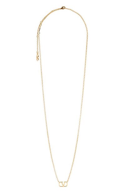Колье в виде цепочки выполнили из недрагоценного металла с золотистым финишем. Регулируемое по длине украшение дополнили брендированной пластиной и подвеской-эмблемой VLogo Signature.