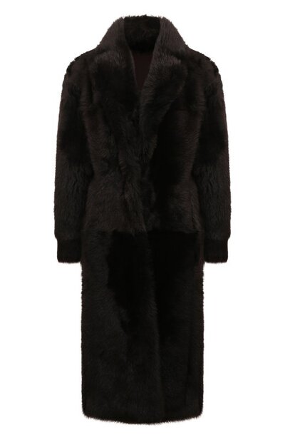 Шубу с широкими лацканами выполнили по лекалам классического однобортного пальто. Для пошива прямой модели с потайной застежкой использовали овчину с густым ворсом.