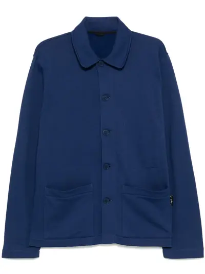 navy blue organic cotton front button fastening two front patch pockets long sleeves fleece lining internal patch pocket
