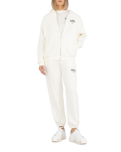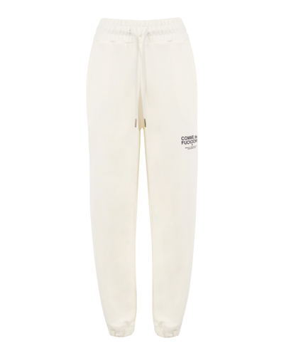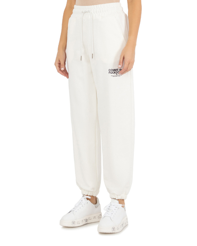 Брюки с манжетами по низу изготовили из хлопка. Пояс на эластичной резинке с шнурком. По бокам расположили два врезных кармана. Спереди нанесен брендированный принт. Эта модель прекрасно подойдет для занятий спортом или вечерних прогулок в комплекте с объемным свитером или худи.