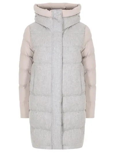 -Серый удлиненный стеганый пуховик колор-блок из смесового кашемира от HETREGO.