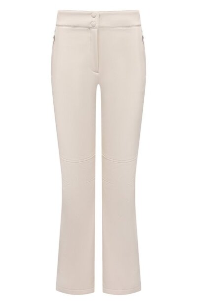 Брюки с вытачками на коленях и регулируемыми патами на широком поясе сшили из эластичного непромокаемого текстиля на основе полиэстера. Модель дополнили боковыми карманами и разрезами сзади, застегивающимися молниями.